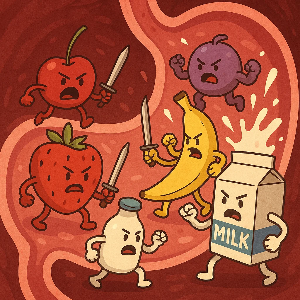 👩🏽⚕️: Different foods require different digestive environments and enzymes to be properly broken down. Fruits digest quickly and easily, while milk takes much longer. When consumed together, the fruit gets held up in the stomach along with the milk. The fruit then begins to ferment, creating toxins we call “ama.”