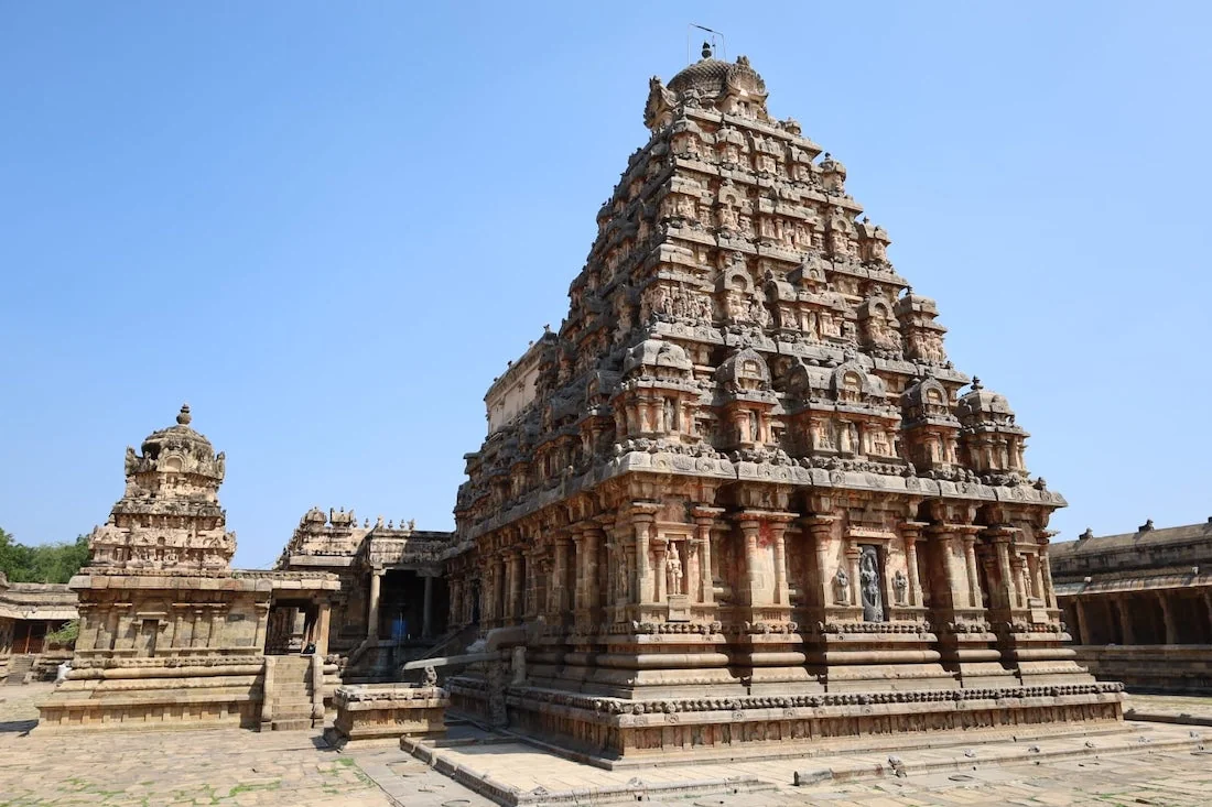 The Airavatesvara Temple at Dharasuram, near Kumbakonam in Tamil Nadu, is one of the most exquisite examples of Chola dynasty architecture, built in the 12th century by Raja Raja Chola II. This UNESCO World Heritage Site stands as a testament to the artistic brilliance and engineering prowess of the Chola craftsmen.